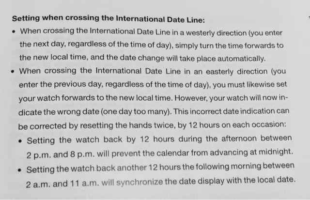 The above instructions should carry you through most situations. But here's an ingenious move that works when crossing the international date line. And this instruction will also work with most simple calendar watches, so you won't need to turn your date indicator through 30 days to get back to the right date.