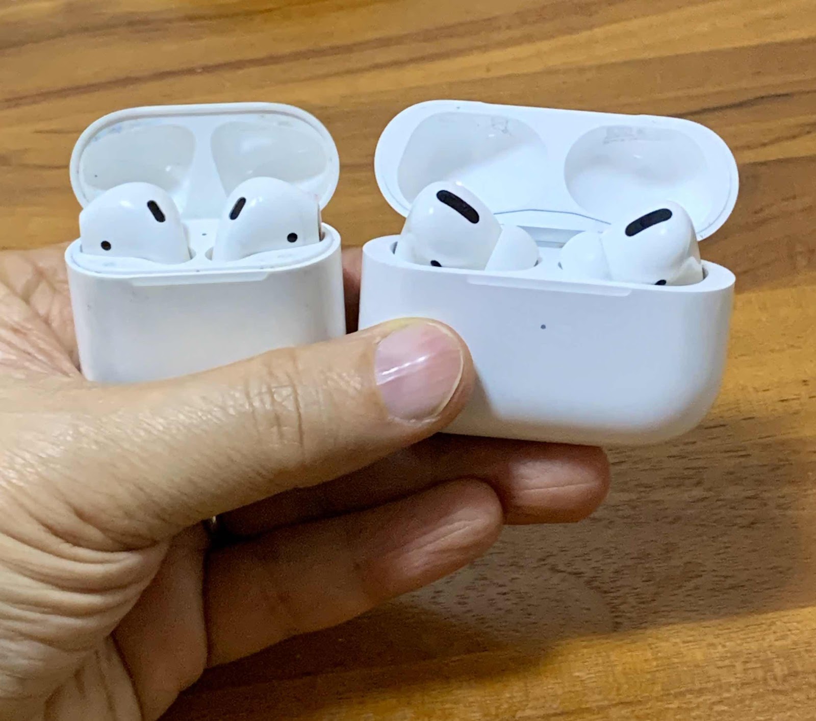 The Apple AirPods to the left, and the Apple AirPods Pro to the right. Overall size of the case are the same. The AirPods Pro seem a bit heavier, due to the added tech and battery life.